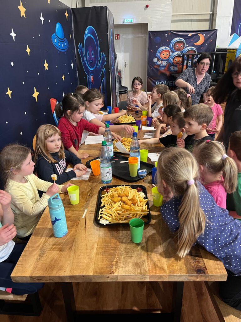 Zwischendurch stärkten sich alle bei einer gemeinsamen Pause mit Pommes und Chicken Nuggets, bevor es anschließend wieder energiegeladen weiterging.